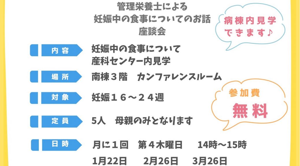 2025年1月より、当院で妊婦検診を受けている方向けにマタニティごはん教室を開始しました。妊娠中に大切な栄養や気を付けたい食事について管理栄養士がお話しします。教室後に産科センターの病棟見学も行っております。