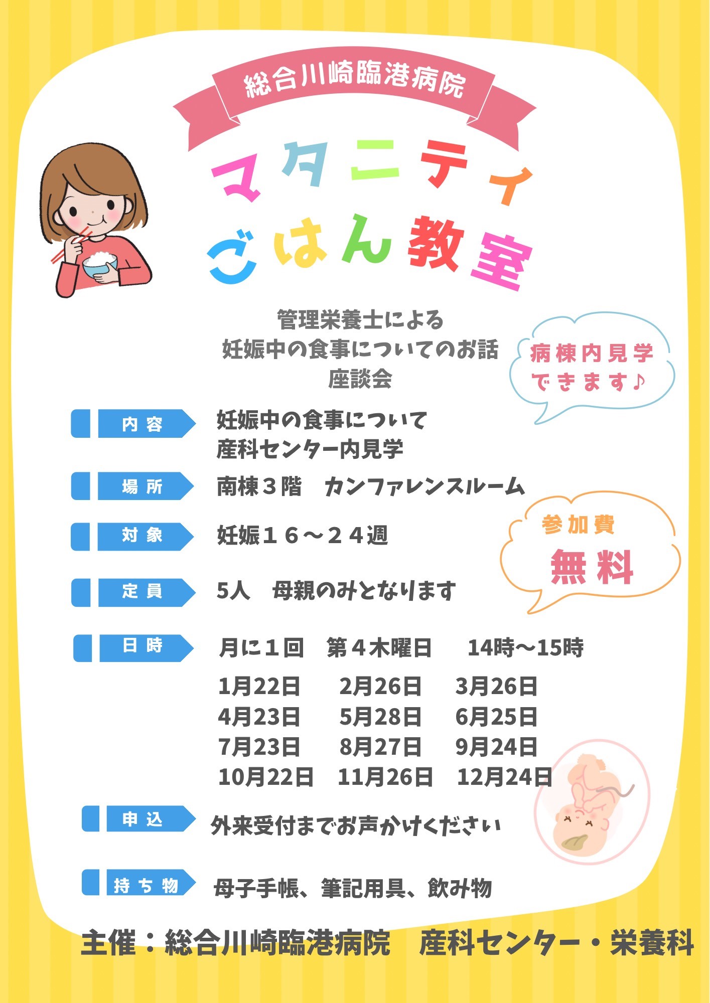 2026年のマタニティ食ごはん教室のスケジュールを掲載いたします。参加費は無料です。ご希望の方は産科外来受付にお声がけください。