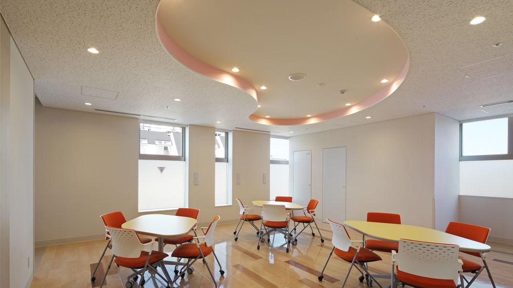 デイルームの天井は、安産祈願の勾玉をモチーフにしたデザイン。
